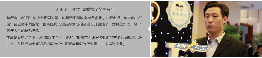 鄭州市力康假肢矯形器有限公司(簡稱力康),是一家專業(yè)從事假肢矯形器的設計、研發(fā)、制作及裝 配的專業(yè)機構(gòu)。成立于1992年是河南省唯一一家福利企業(yè)。力康下設業(yè)務部、技術部、住院部、康復 部、售后服務部,并配有現(xiàn)代化的裝配車間和功能齊全的訓練大廳,為殘疾朋友康復訓練提供了可靠 保障。總經(jīng)理穿戴假肢多年,有著豐富的臨床經(jīng)驗和親身體會;多年來,力康已為全國幾十萬名殘疾 朋友安裝上舒適、美觀、耐用的假肢和矯形器具,使他們更大限度地恢復了正常的工作和生活。“產(chǎn) 品即人品”的質(zhì)量理念、先進的技術、實惠的價格、完善的售后服務是力康取勝的法寶……